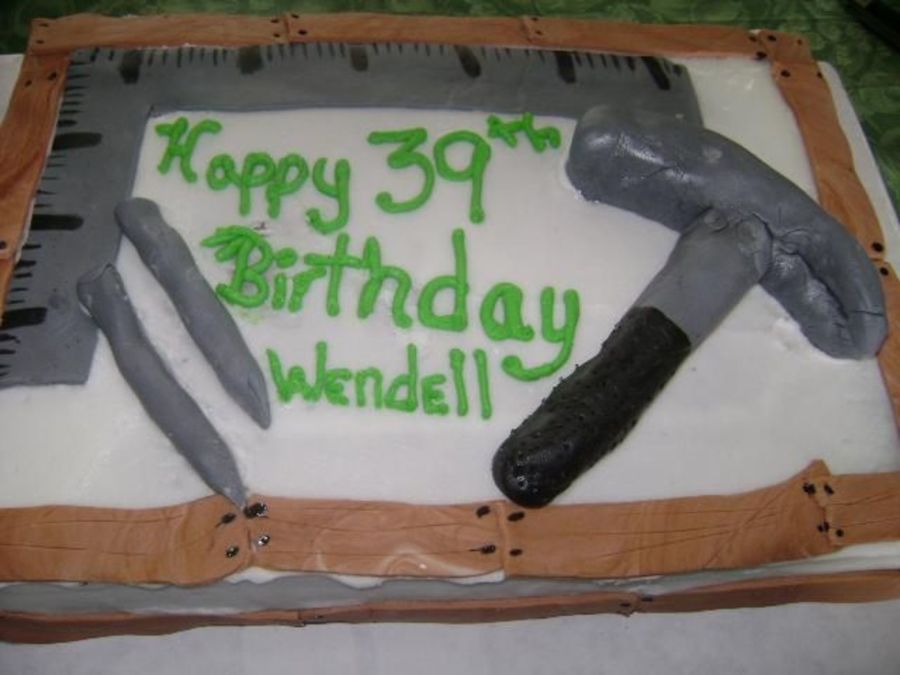 This was my first attempt at mmf on a cake.. DH says the hammer head was too large but needless to say i'm no artist. It was 1/4 chocolate with mmf accents. It was fun to do.