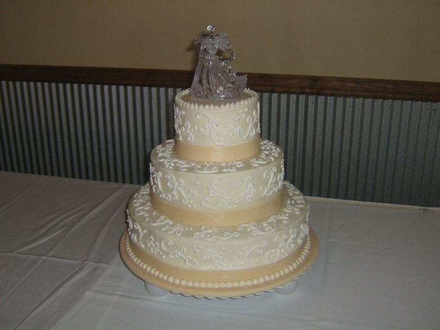 6", 10", 14" round - off white BC with white scrollwork and dots; off white MMF ribbons and covered board.