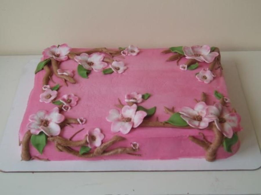 Bride's colors are pink and brown. Flowers are dogwoods. They wanted just a sheet cake in pink and brown with dogwoods. No writing and nothing else so that is what I did. :] Chocolate cake.