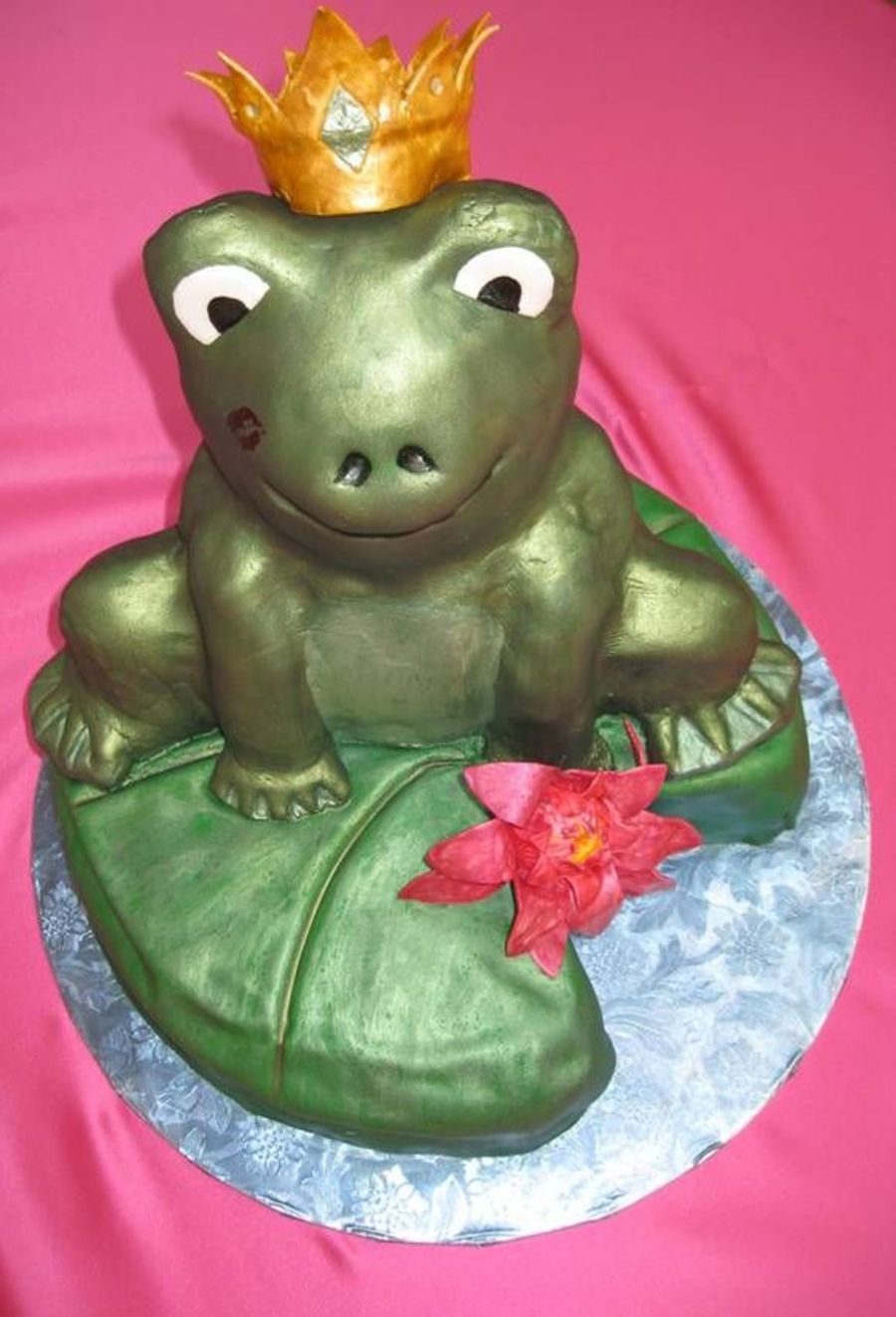 I used a teddy bear mold and rice crispies to make the frog body. And a 12" cake that I carved for the lilly pad. I covered them both in fondant. I painted the whole thing with sparkle dust. The crown, eyes, and lilly are made out of gum paste. I used a rubber stamp and gel food color to make the kiss on his cheek.