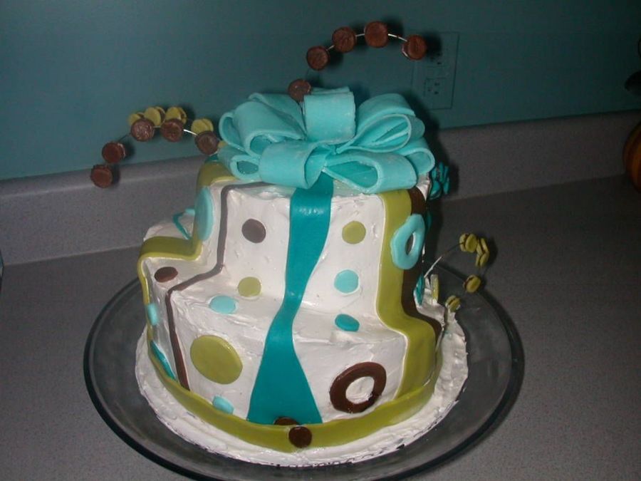 Here is a cake that I just wanted to try that I saw on CC. It was a first for me on a lot of levels.I had a lot of trouble w/putting the wires into the cake so that they would be protected from leaving any remnent in the cake(my first concern)and so they didn't slice thru the cake which they did. I put the wire into a straw that I pushed into the cake but the weight of the discks of fondant attached to the wire I believe weighted them down causing the straw to break thru the cake as well. Any suggestions?
