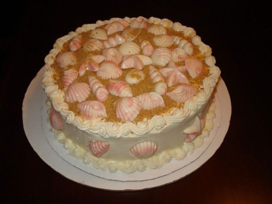 Birthday cake for my mom. Bailey's irish Cream cake, butter pecan filling, white chocolate BC frosting. All recipes from CC and it was DELICIOUS, thanks!! Wilton melt seashells and graham cracker sand