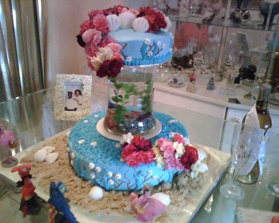 Vanilla layers with buttercream accents, Real flowers, and Vase contains real fish. Cake was a hit at the party.. everyone loved the real fish