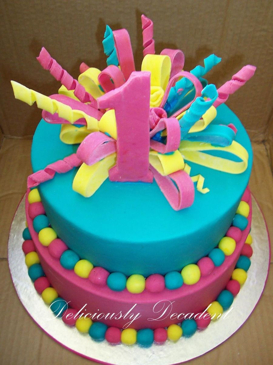 made for a little girls first birthday/christening. the mother indicated what the cakes where to look like with the ball border but left the top decoration up to me and i saw the ribbon style topper on a few cakes on here and wanted to give it a go I really like the bright fun way they look. i also added a couple of roses to the middle of the bow but its a bit hard to see them here (I forgot to take a photo until it was already boxed!)