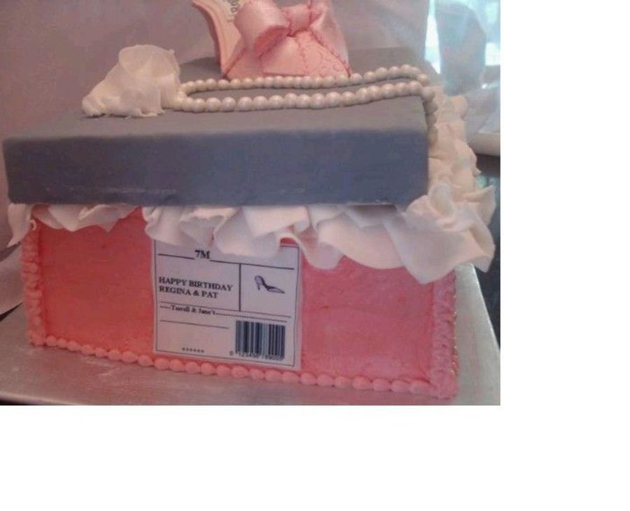 I hated to post another picture of this cake, but I wanted to show the box label on the end of the cake. I worked hard on it. I thought it was cute. It said "Happy Birthday " and had the ladies names on it. It also had the son and his