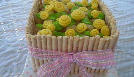 Three 9" rounds in buttercream. I had some cake trouble and ended up running out of time on the towers. I used pink marshmallows on skewers stuck into a cupcake on top for the towers instead of the rice krispie treats. Turrets are ice cream cones covered in white choocoalte and dipped in pink sprinkles. Mini roses are made from starbursts.