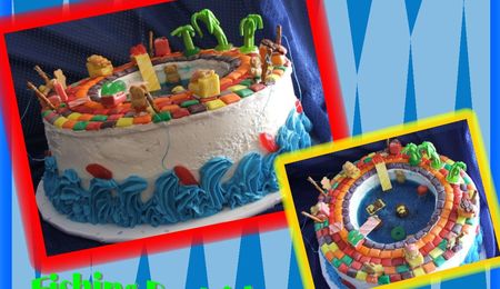 Iced in buttercream, with a shear ribbon trim and free-hand scroll work. Inspired by a design from online only I can't remember where I saw it. It may have been here. Just changed the colors.