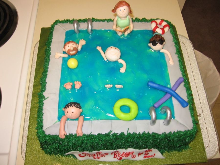 This was a small cake done for a pool party. I can't remember who's cake I used as inpiration but thanks! It was fun to make. I'm the one in the big dark glasses! :) BC grass/Fondant sidewalk/piping gel pool/gumpaste/fondant figures.