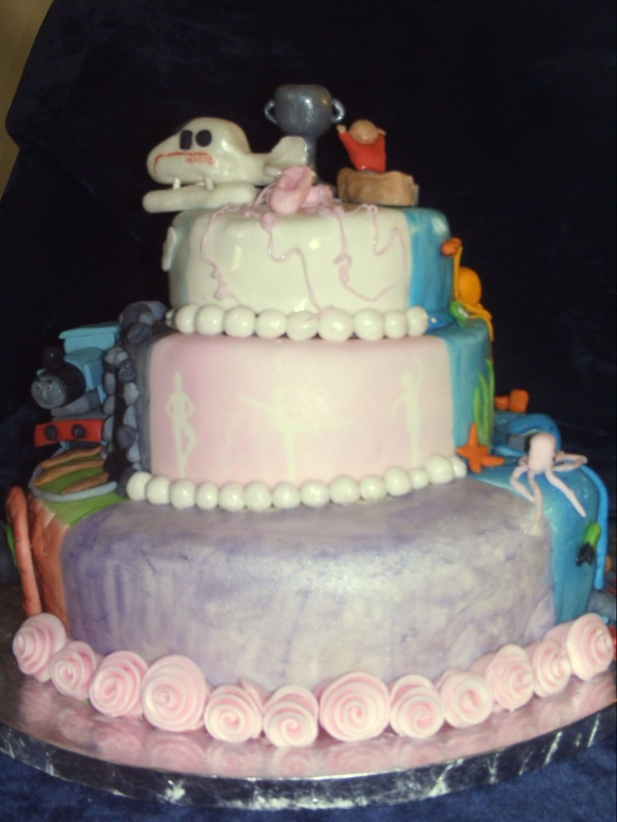 This is one side of a four sided cake. This cake was made for four cousins a;;all with March birthdays. Each side has a different theme. The other themes were Tomas the Tank, soccer, and underwater. This side is airbrushed ballarenias, which are hard to see in this pic, fondant ribbon roses and gum paste ballet slippers.