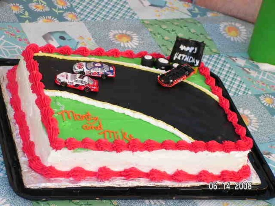 I used a 1/4sheet, iced the sides, used rolled fondant for the track, tire and sign. The cars were store bought. I did one for a bday and another one for a fathers day cake.