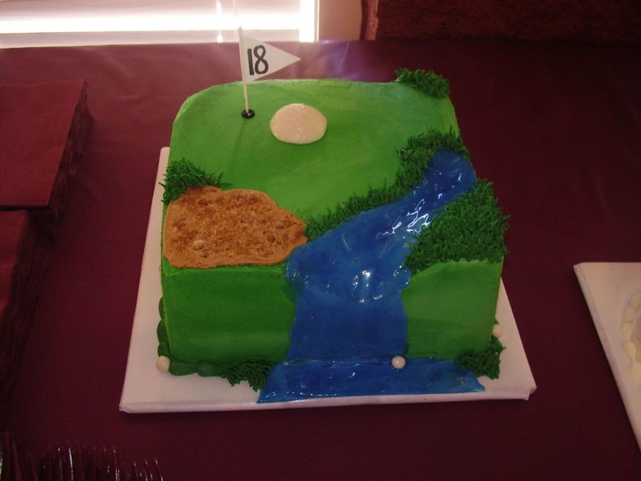 8 x 8 mint choc. chip cake w/choc. mousse filling. Carved out small portion of cake to create waterfall. Used piping gel to give shine to water. BC frosting.