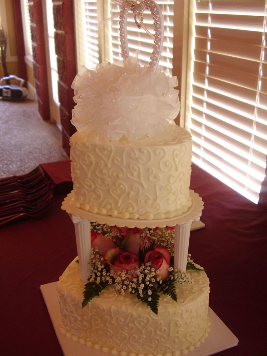 2 tier heart cake...both cakes white w/ straw. filling. Fresh flowers on bottom tier. 6" & 9" heart pans used.