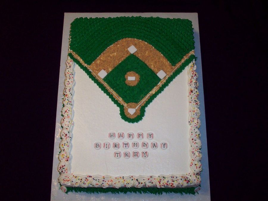 The little baseballs are fondant, the dirt is crushed graham crackers and the rest is buttercream. The cake is French Vanilla. I also make chocolate cupcakes that look like baseballs and cookies that are baseball and baseball gloves.