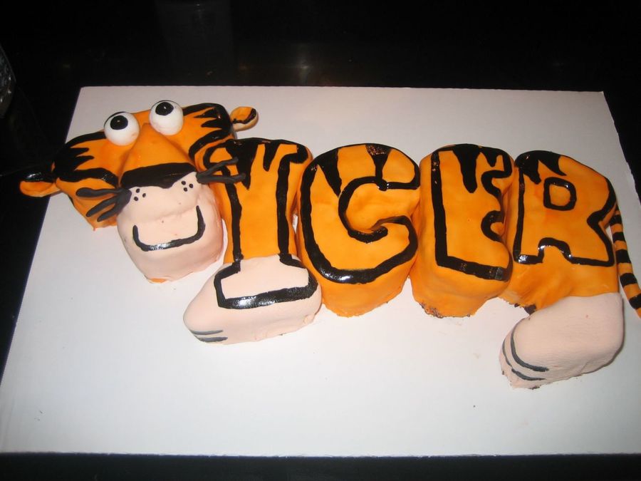 This cake is Tiger from the PBS cartoon "Word World." The cake was chocolate, filled with whipped chocolate ganache, and coated with marshmallow creme buttercream icing and fondant. I used a sheet cake and carved out each letter, just like the tiger toy from the show. My 3 year old loved it!