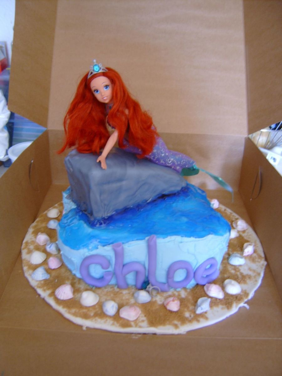 The name and rock are fondant, shells are white chocolate. Cake is covered with buttercream and blue tinted piping gel for the water.