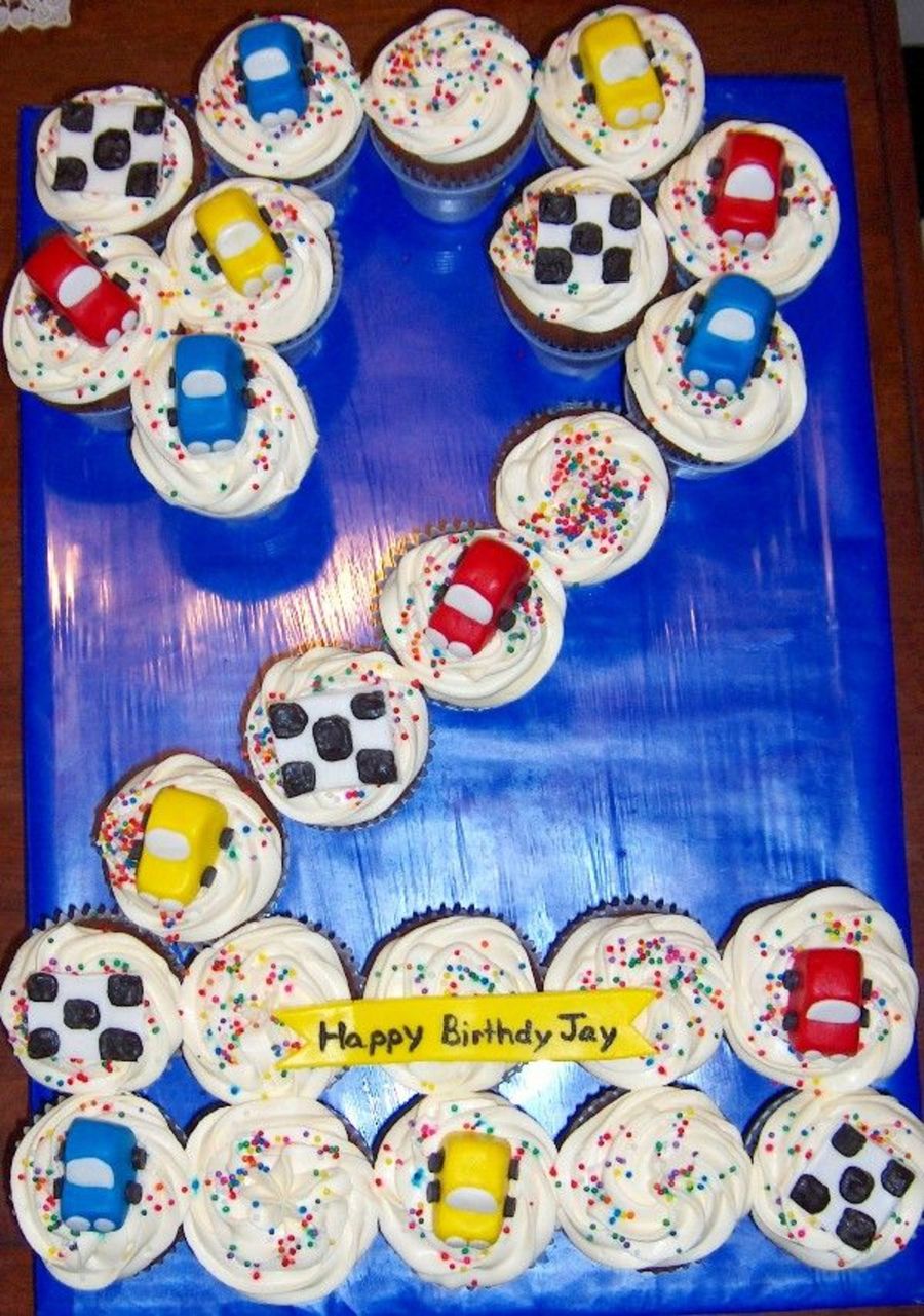 *inspired by dabear's car cupcakes. These are chocolate/chocolate chip with whipped cream icing. The cars, flags and the banner is MM fondant.