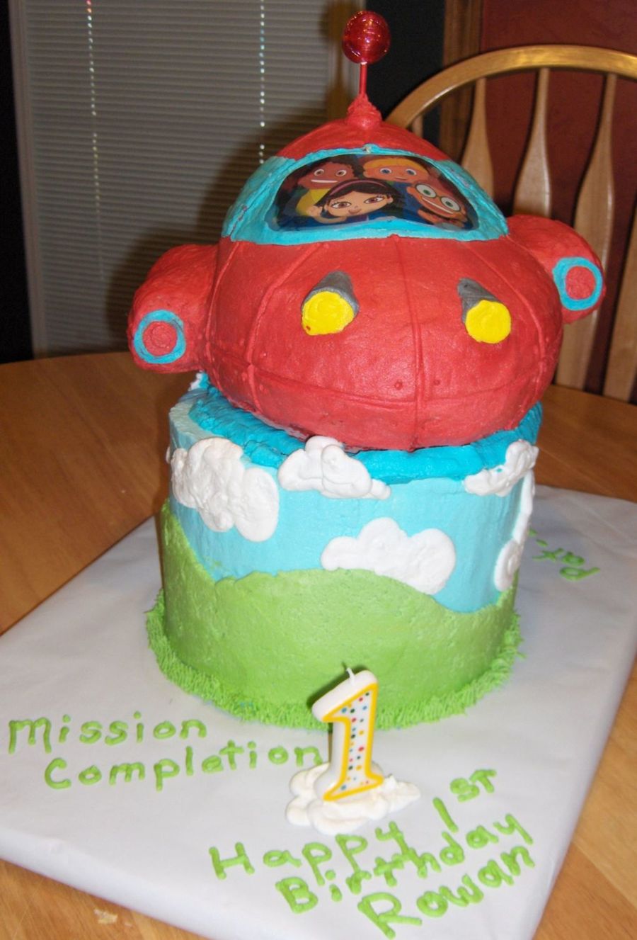Birthday cake based on little einsteins, Rocket, for grandson's 1st birthday. Everything is edible except the laminated character picture. the side rockets are made from rice Krispies treats.