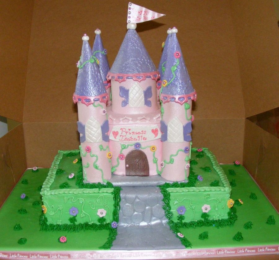 9x13 with an almost 5 inch(actual cake) castle on top. Sprayed the whole castle with PME pearl lustre spray. I think used almost a whole jar of pink and rainbow Pixie dust for the glitter! Turrets were made with gumpaste made on posterboard forms. Towers were gumpaste made withe paper towl and bean can forms. Used RI icing on the vines on castle. I covered the cakeboard with RI.