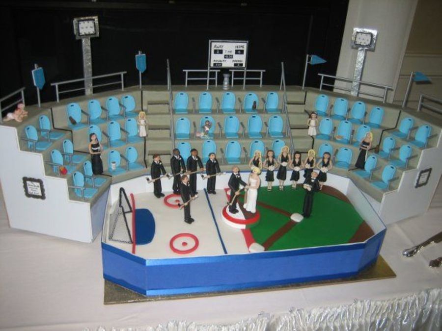 This unusual wedding cake was made for a couple who are avid sports players and are extremely competitive! All the speeches at thier wedding were sports related... it was awesome... the rink/field is the only edable part, the stands are fondant covered foam core, gumpaste seats and snacks, polymer clay figures of the entire bridal party, battery powered lights and apporximately 120 hours of work... man I'm tired.. lol....... thanks for looking