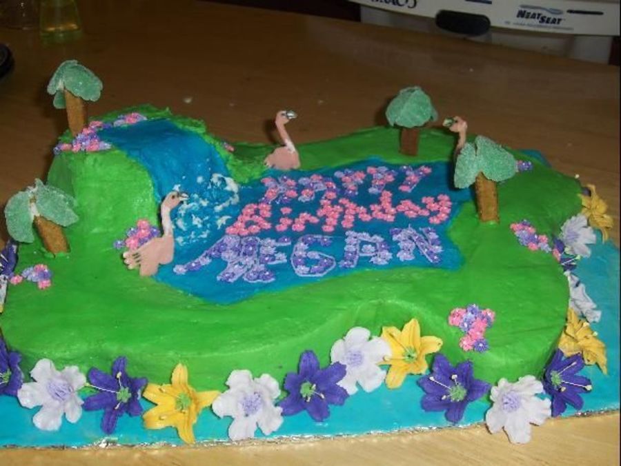 This was a fun cake for me. I made color-flo flamingos, their necks broke I had to "glue" them together. The tree's are candy fruit wedges and cookies. I used my favorite tasting (not working) frosting, white chocolate whipped. The flowers are all royal icing. I used small drop flowers to spell out Happy Birthday Megan in the water.