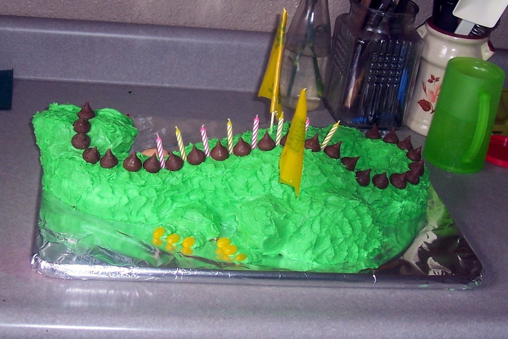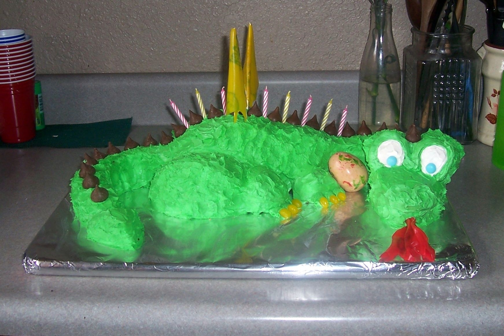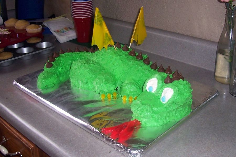This is a cake made for my middle son. Round cakes cut into specific shapes make up his body, tail, head, legs & neck. Cupcakes were added for the eyes and feet. I tried dappling the frosting to make it look like scales (hard to tell in the picture.) Final details were jellybean toenails, m&m eyes, hershey kiss scales and fruit roll-up wings & fire.