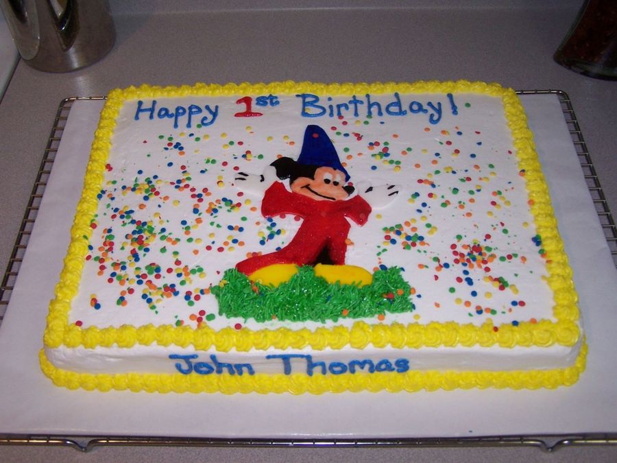 buttercream icing with handpainted fondant mickey mouse. confetti sprinkles. grass under mickey's feet is buttercream also.