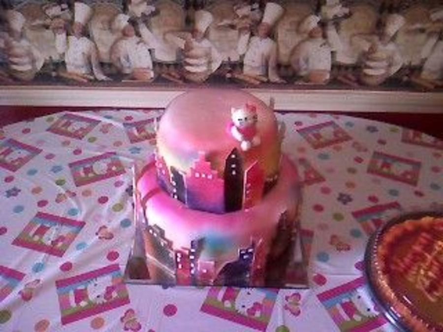 This one was done for my daughter. Scaled down as we didnt need that much cake. Also added the hello kitty it is GP and wasnt in the original design. Buildings are also GP. Covered in MMF. Thanks for looking!