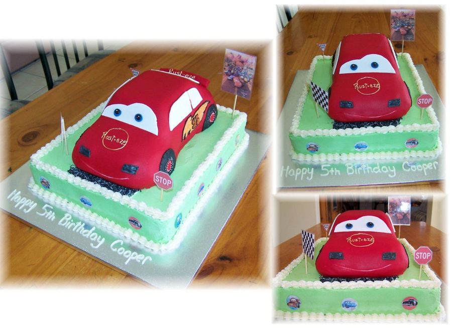 Lightning is choc mud cake with fondant icing and slab is vanilla buttercake with bc icing. Bit dissapointed with wheels, next time I will make out of fondant and put on.