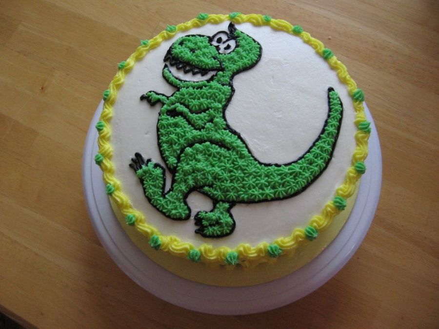 For my son's 5th birthday. This was an 8" round with buttercream frosting. I found the dinosaur picture on the internet and had my husband draw it onto the top of the cake. I then outlined and filled it in with stars.