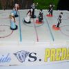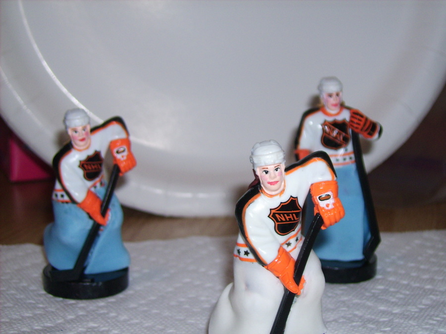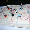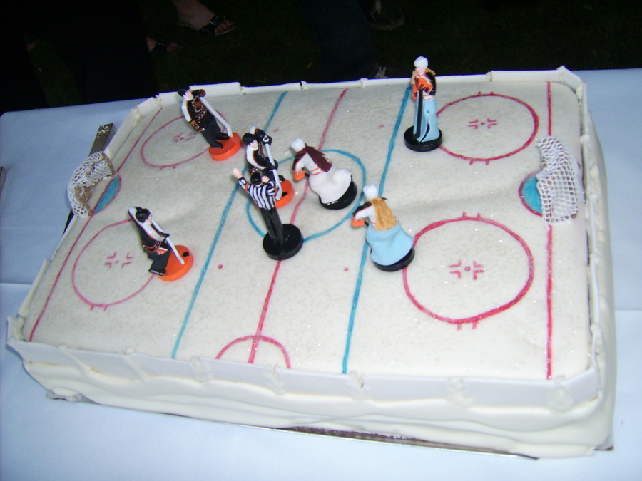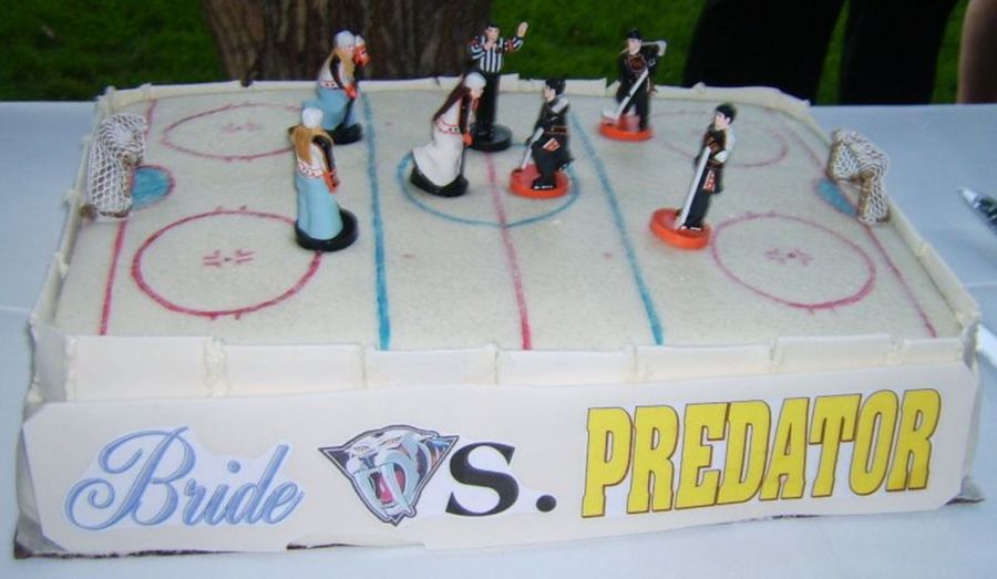 Groom, who is my new brother-in-law, plays hockey on a team named The Predators. Sister snuck his hockey chess set to me and I used gum paste to model dresses, hair, coat tails, pants, etc coming out from underneath the "shirts" to look like the bride and bridesmaids playing against the groom and groomsmen. Cake unfortunately had some issues in transport, so sides look a little off. Sprinkled cake with edible sparkles to look like ice. Goals were floral wire and netting.