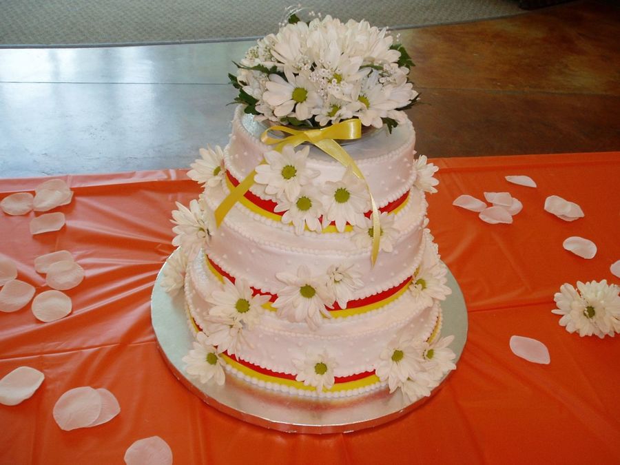 The bride picked out the ribbon to match her color theme. She wanted fresh daisy's. I also made the cake topper. Very fun for my first wedding cake.