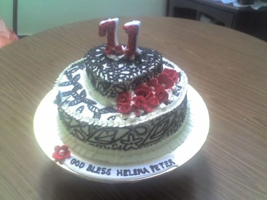 Cake for a 71 year old mum whose favourtie colours are red, white and black. It was time consuming and put me back in time for the other two cakes I had to make but I enjoyed doing it.