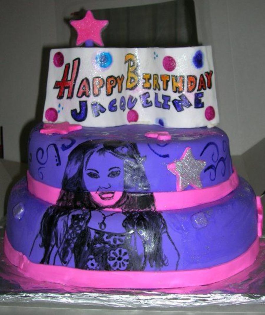 I covered the two tiered cake with fondant and then painted on my daughter's fav. pop star