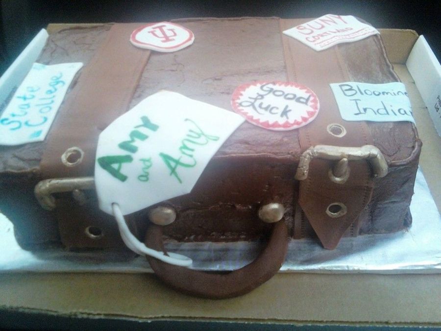 This is a going away party cake for two of my friends Amy and Amy. They were going to College Station and Cortland, NY. Made with choc. buttercream and fondant for the buckels and straps. I use fondant fo rteh "stamps" on teh cake to. I got great ideas from all the wonderful cakes here on CC!