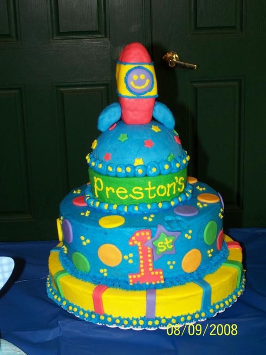 Stacked chocolate and white cakes decorated with buttercream and fondant accents. The rocket is made out of a rice krispie treat covered in fondant. This cake was designed after the 1st birthday invitation provided by the customer. As you can see, we were unable to snap the picture before one kiddo got their lil fingers in it!! :)