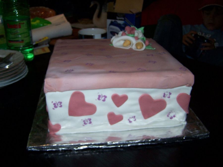 Gift box cake for my Mom. Covered in Fondant with Fondant accents and Butterfly Stamp. First time trying myself on Fondant flowers. Ribbon Roses and Cala Lilly's. Mom loved it.