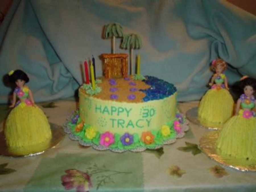I used crushed graham wafers for the sand and pretzels for the hut. (The pretzel idea was from another cake that I had seen on this site). For the trees, I used plastic egg cartons and piped icing over them using the striped icing technique.