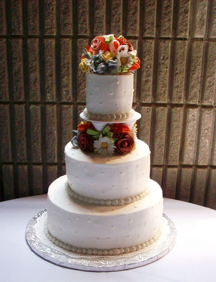 Buttercream, gumpaste flowers and leaves and ribbon fillers.