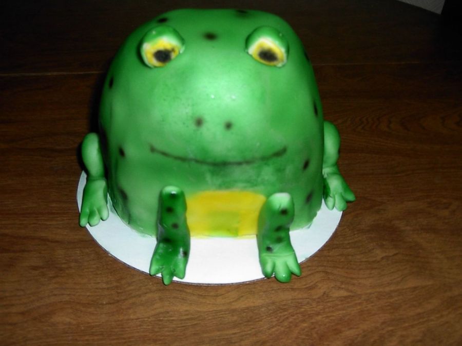I made this for a friend's birthday. It's two 7x2" rounds and a bowl shaped vanilla cakes that were stacked, filled, and carved into the desired shape. Then the whole cake was covered in fondant. Legs and eyes are also made from fondant. The whole cake is airbrushed.
