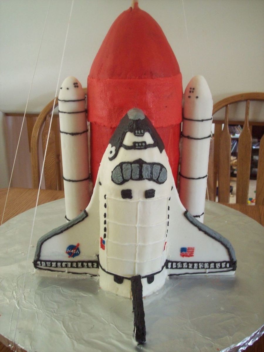 Chocolate cake with raspberry pear filling for the main engine. WASC with raspberry filling for the shuttle and card board tubes covered in fondant for the boosters. Covered with BC. Stands 18 1/2 inches tall