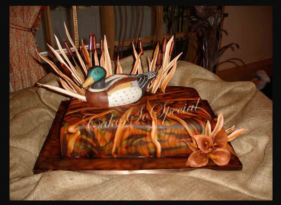 Shadow Grass Camouflage with shadow grass and then airbrushed. Shadow grass and cattails in gum paste. Umber calla lilies with shadow grass. The duck is a ceramic piece provided by the bride. TFL