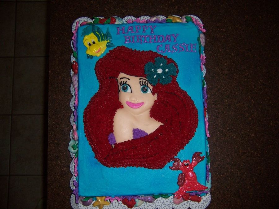 This is the cake I made for my daughters 5th birthday party. The Flounder and Sebastian are all sugar work and the Arial is a candy plaque placed on top of a sheet cake. This was so much fun to make.