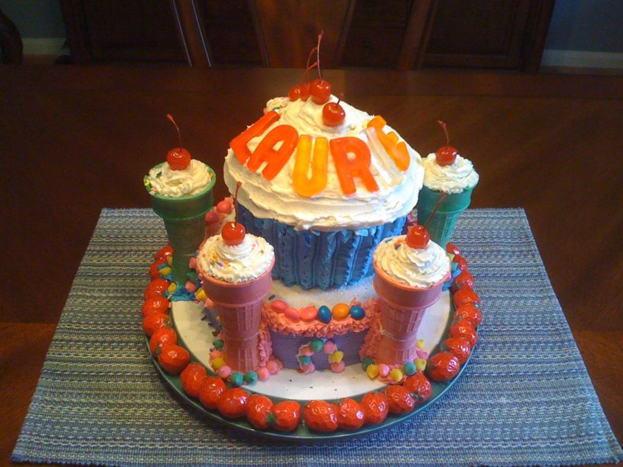 My 5 yr old niece helped me decorate this one. A cupcake castle with buttercream and assorted candy decorations. She had a blast putting all of the candies on it!!