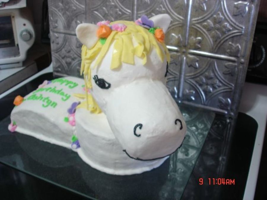 This was a Little Pony cake for a 4 year old girl. She loves horses and wanted a pony cake. I used the styrofoam wig head (with carved styrofoam for the nose). Half white/ half chocolate fudge cake with buttercream icing. The flowers were buttercream. The hair and butterflies were fondant. This was my first attempt at a pony. The little girl LOVED it.