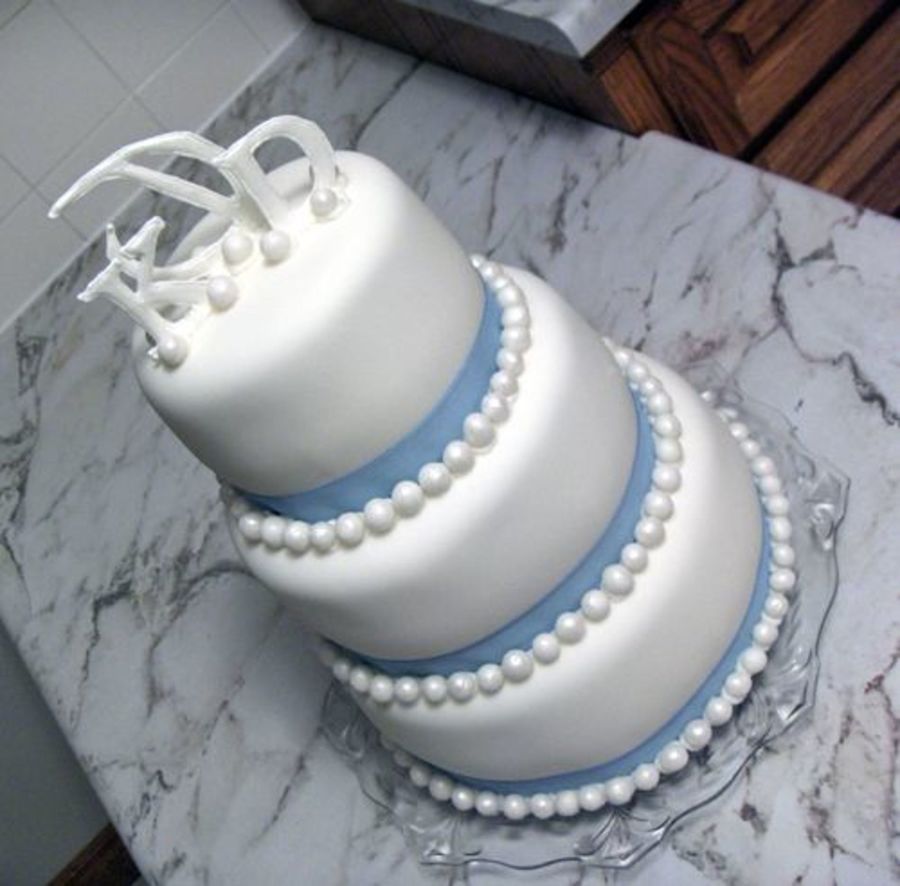 three tier fondant with pearls ribbon and monogram initals on top