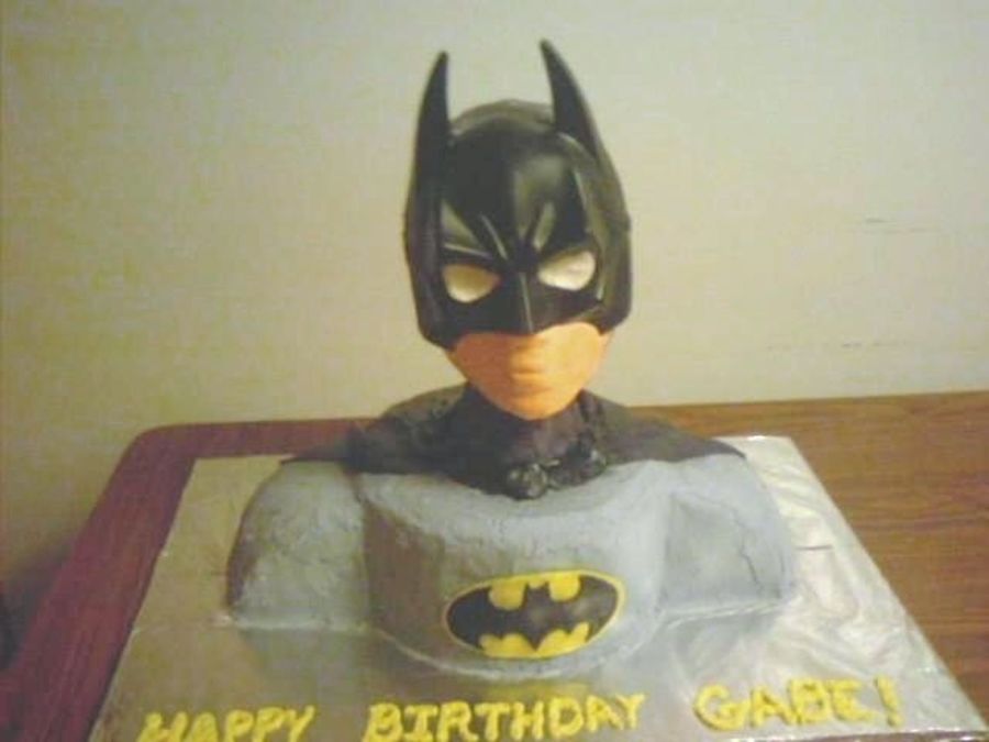 3-d Batman cake done for a 4 year old's birthday. His chest is chocolate cake with caramel filling. His shoulders are strawberry cake with strawberry buttercream filling. Done in buttercream, which I cannot get smooth to save my life. Head is a styrofoam wig dummy covered in buttercream. Tried the Wilton black spray coloring...not thrilled. The mask is part of his gift. Cape, face, Batman logo done in fondant. Thanks for looking!