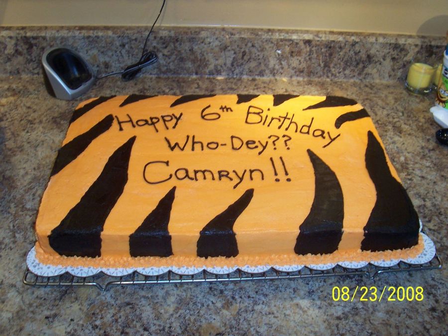 I made this for my friends sons 6th birthday. He is a huge Cincinnati Bengals fan. Its just a sheet cake with orange buttercream icing and black buttercream stripes.