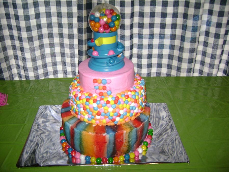 All buttercream with bubblegum border around the bottom layer & bubblegum machine on top.