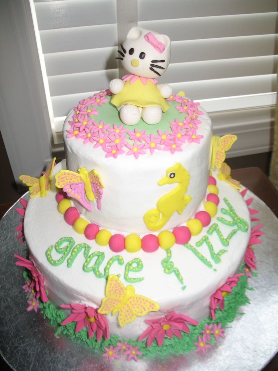 This was for a joint birthday for 5 and 6 y/o girls. One wanted Hello Kitty and the other wanted pink flowers, beautiful butterflies and a seahorse.