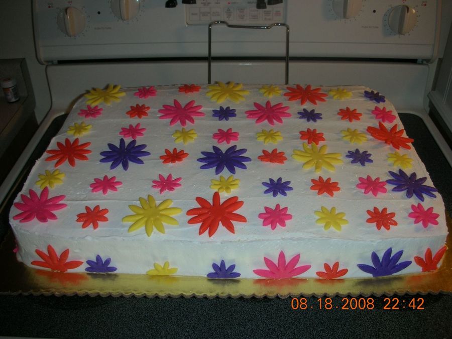 This was made for a religious event. It's almond cake covered in almond frosting and decorated with fondant flowers. TFL =)